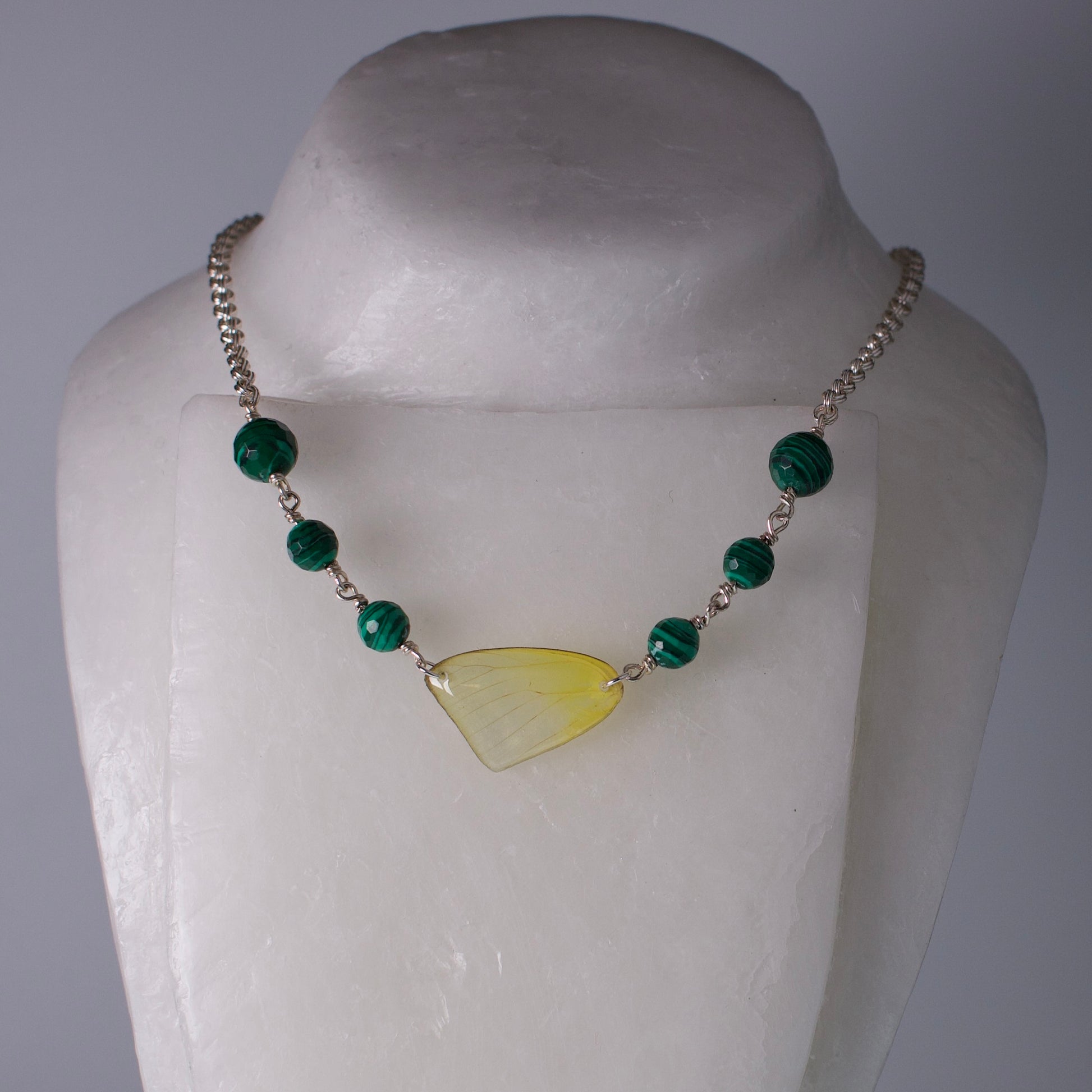 A fluorescent yellow real butterfly wing with striking and rare faceted green malachite. Made from carefully preserved real Cloudless Sulphur butterfly (Phoebis sennae) wing. This conversation piece is playful and bright, for those with a refined taste for rare precious materials. 18" silver double link chain with sterling silver lobster clasp.